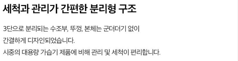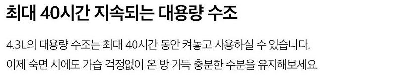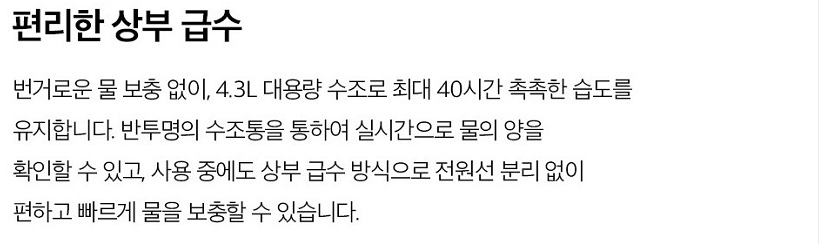 ● 품목 : 초음파가습기 ● 사용면적 : 39㎡ ● 물통용량 : 4.3L ● 급수방식 : 상부급수형 ● 세척 : 분리세척