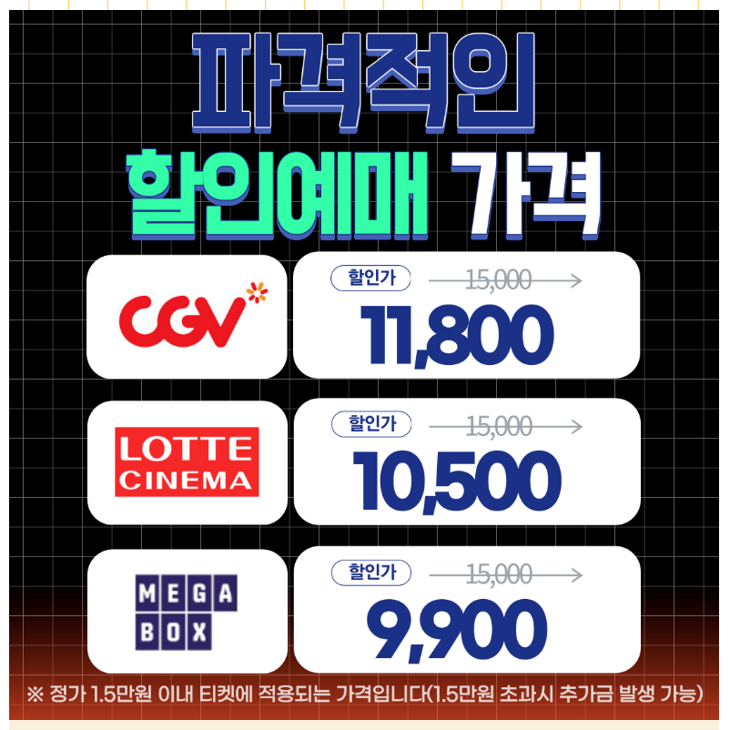 CGV, 롯데시네마, 메가박스 실시간 최저가 영화 예매(전국/당일 가능) 싸게 영화티켓 예매하시어 즐겁게 감상하세요.